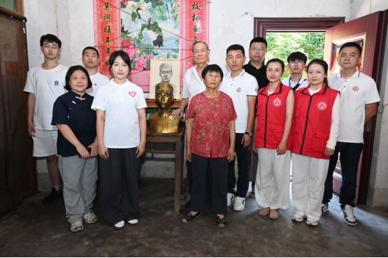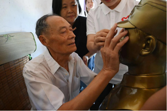 7月31日上午,烈士孟祥斌的遗孀、“为烈士画像”公益活动发起人叶庆华,在72886必赢网址美术学院“红色青春守护人”工作室志愿者的陪伴下,顶着烈日,将一个半米高的黄铜色半身塑像送到朱代元的面前。